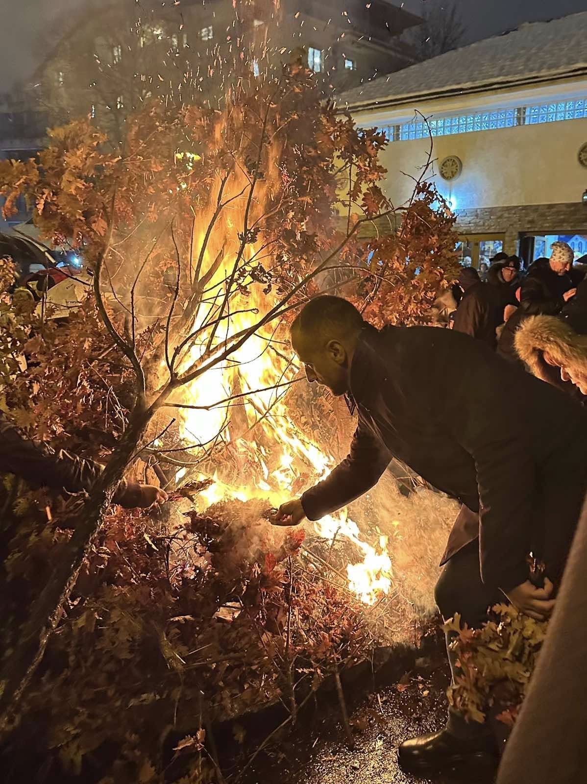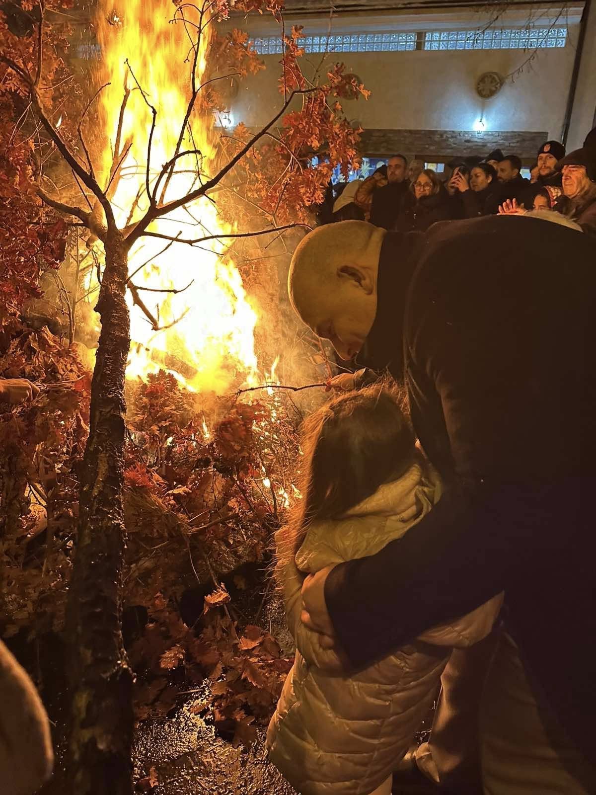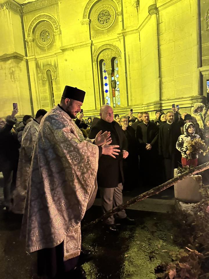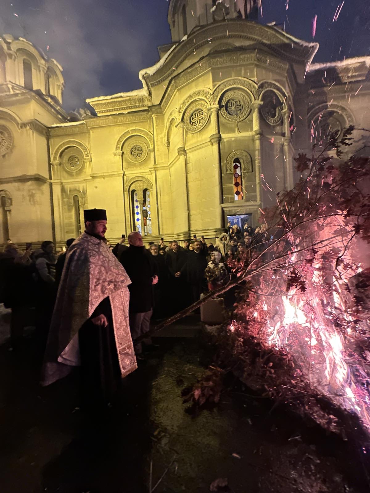 Након уношења, бадњак је освештан, а празничну божићну беседу одржао је протојереј Драган Видовић, старешина Храма Светог великомученика Георгија на Бановом.